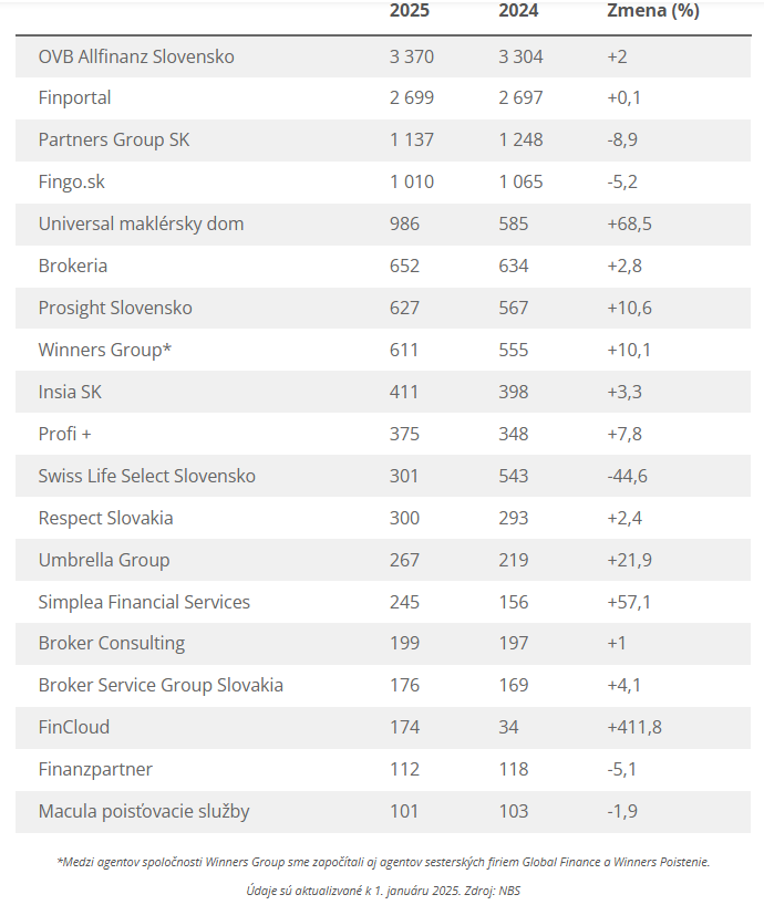V roku 2024 na Slovensku znovu narástol počet sprostredkovateľov. Kým na začiatku roku 2024 túto činnosť vykonávalo 16 923 podriadených finančných agentov, 1. januára tohto roku bolo v registri Národnej banky Slovenska (NBS) zapísaných až 17 420 maklérov. Okrem toho, že finančným sprostredkovaním sa aktuálne živí o takmer 500 ľudí viac ako pred rokom, nastali aj výrazné presuny medzi jednotlivými spoločnosťami.